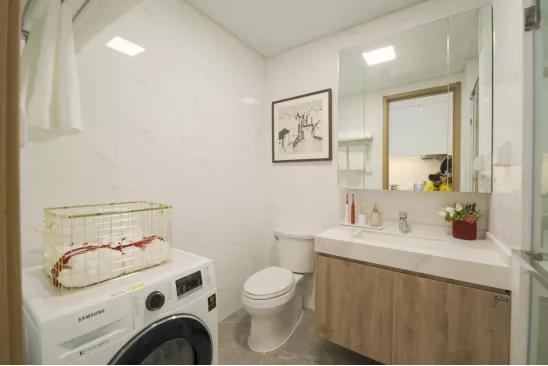 进门左手边便是卫生间,整体采用干湿分离设计,并预留了洗衣机的位置,洗漱台采用台下盆的设计,随手一抹就能清洁到位↓