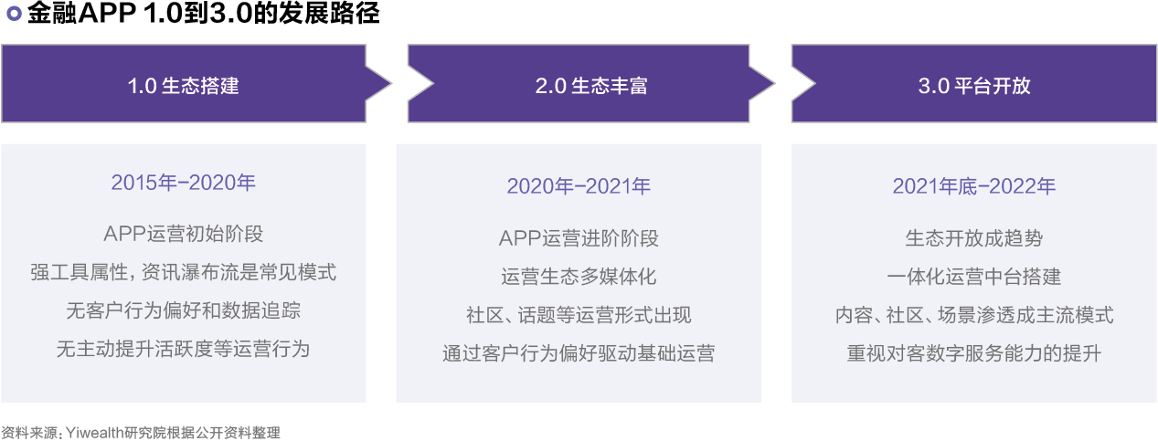 从2015年金融行业APP运营概念初起的1.0阶段,历经2.0运营进阶,到3.0平台生态开放,金融APP运营逻辑也从产品货架式的粗放型运营走向基于人群分层,融合场景、内容、服务于一体的精细化运营。
